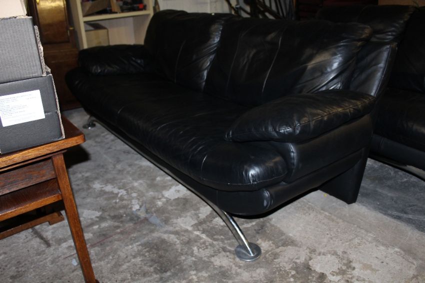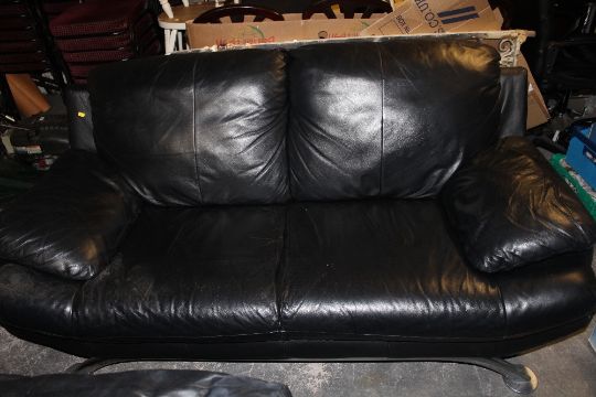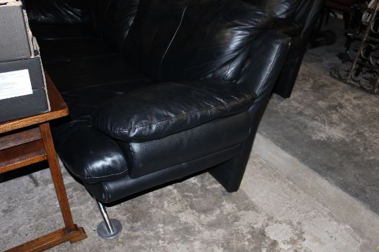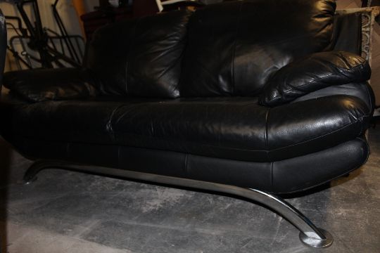 A BLACK LEATHER TWO PIECE SUITE RAISE ON CHROME EFFECT SEAT COMPRISING 2 & 3 SEATER SETTEES