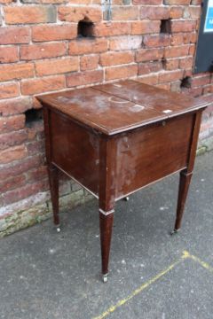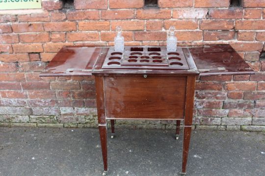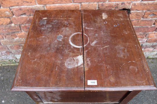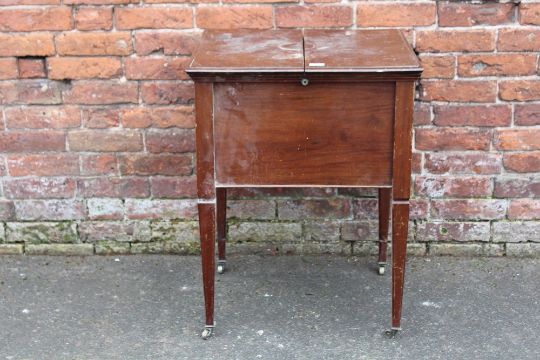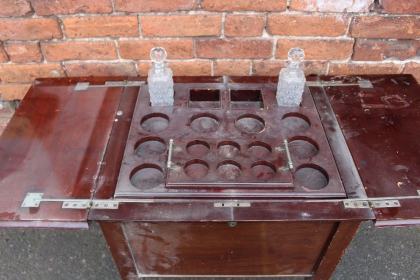 AN EARLY 20TH CENTURY MAHOGANY 'SURPRISE' DRINKS CABINET RAISED ON TREADLE LEGS H-76 W-61 CM