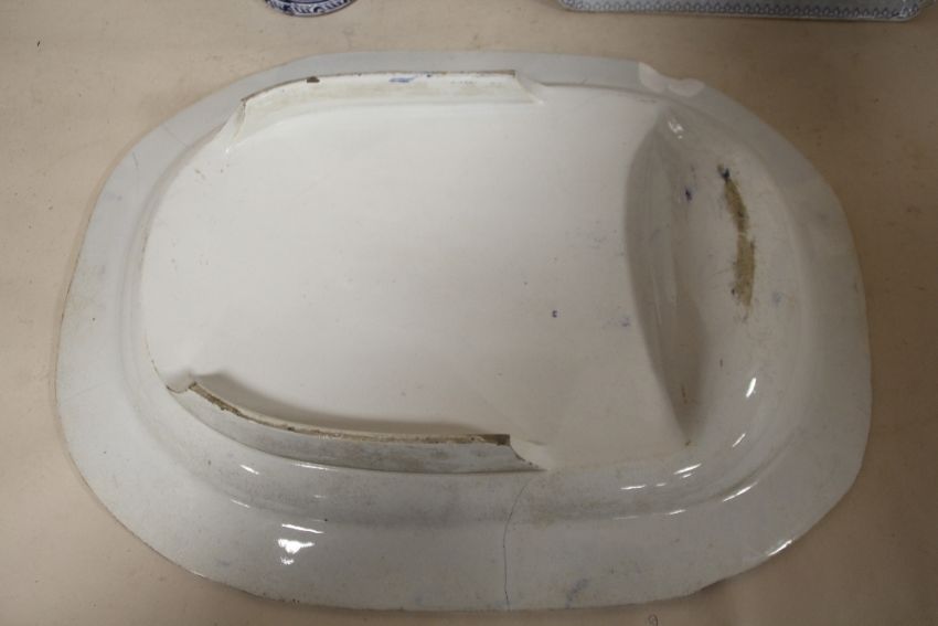 A JOHN RIDGWAY OCTAGONAL BLUE AND WHITE MEAT PLATE TOGETHER WITH A LARGE BLUE AND WHITE PATTERN MEAT DISH AND A BLUE AND WHITE VASE, A/F (3)