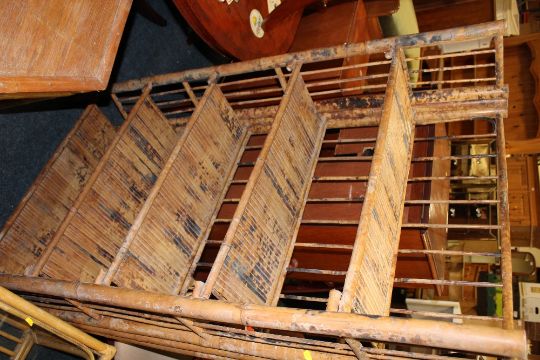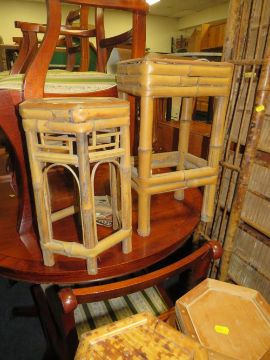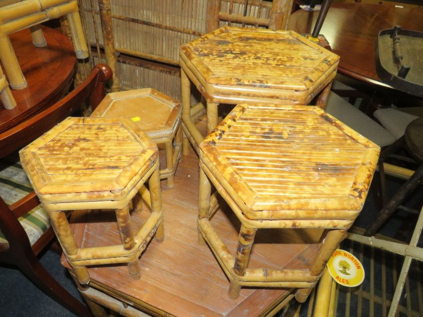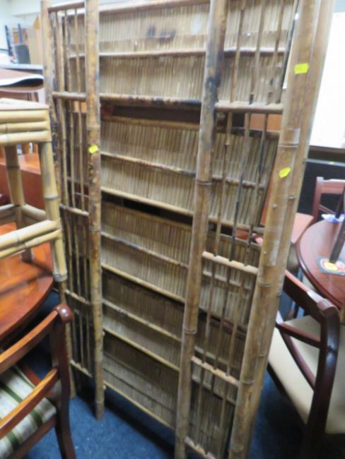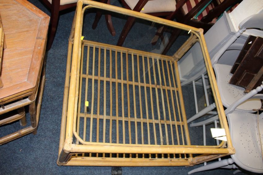 A COLLECTION OF WICKER FURNITURE TO INCLUDE A FOLDING BOOKCASE, GLASS TOPPED TABLE, HEXAGONAL TABLE AND SMALLER TABLES ( QUANTITY )