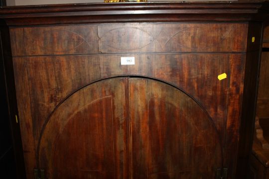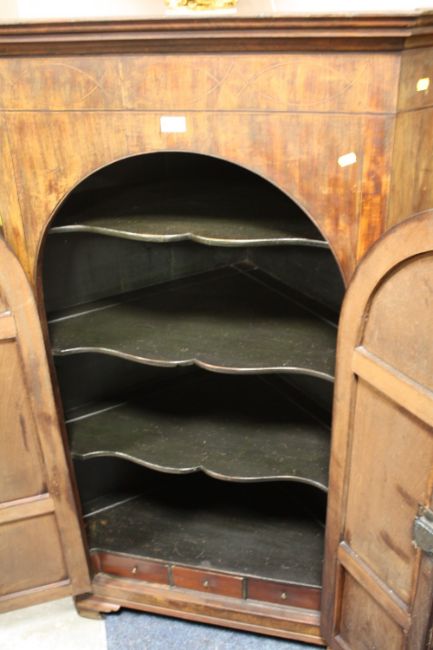 AN ANTIQUE MAHOGANY AND INLAID TALL CORNER CUPBOARD H-141 W-93 CM