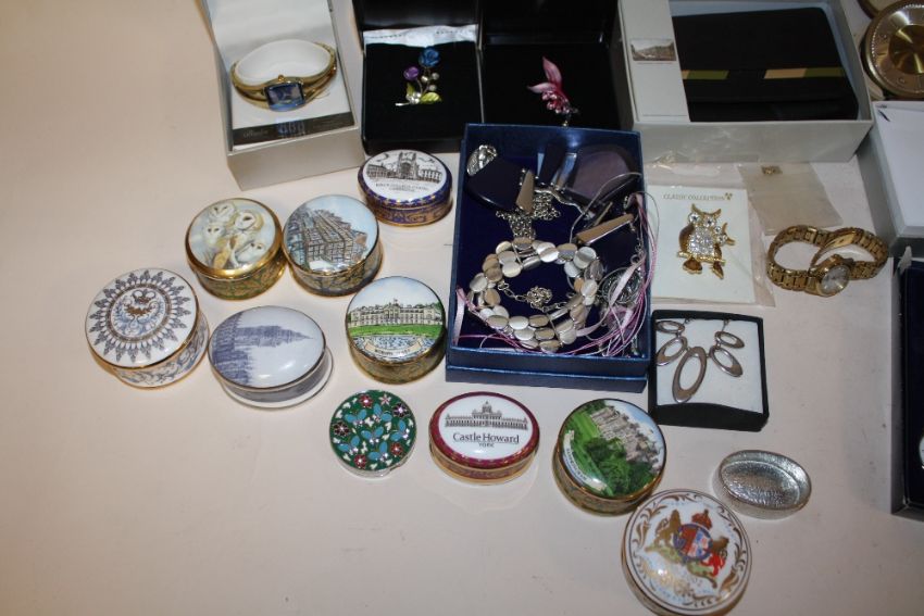 A BOX OF COSTUME JEWELLERY AND COLLECTABLES TO INCLUDE CERAMIC TRINKET POTS FOSSIL PURSE, WATCHES ETC.