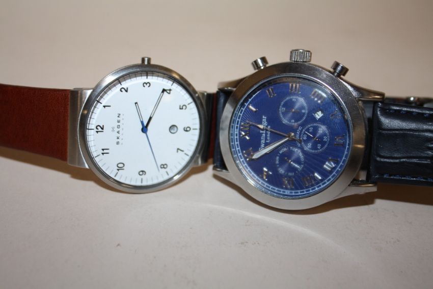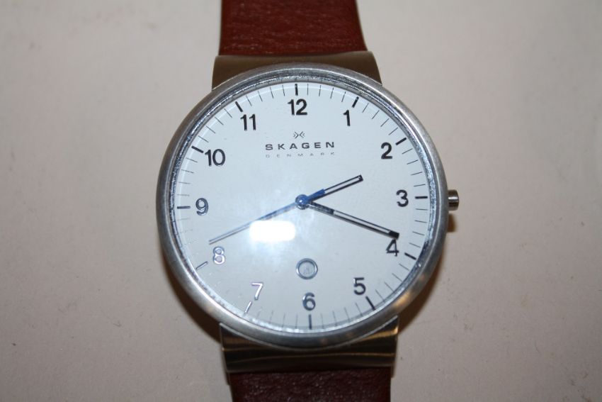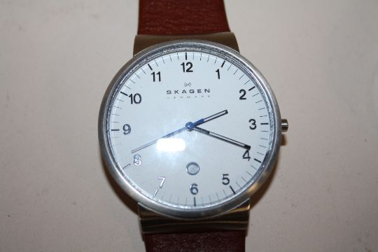 A GENTS SKAGEN SKW6082 DATE WRISTWATCH, TOGETHER WITH A SWAN & EDGAR OF LONDON AUTOMATIC EXAMPLE (2)