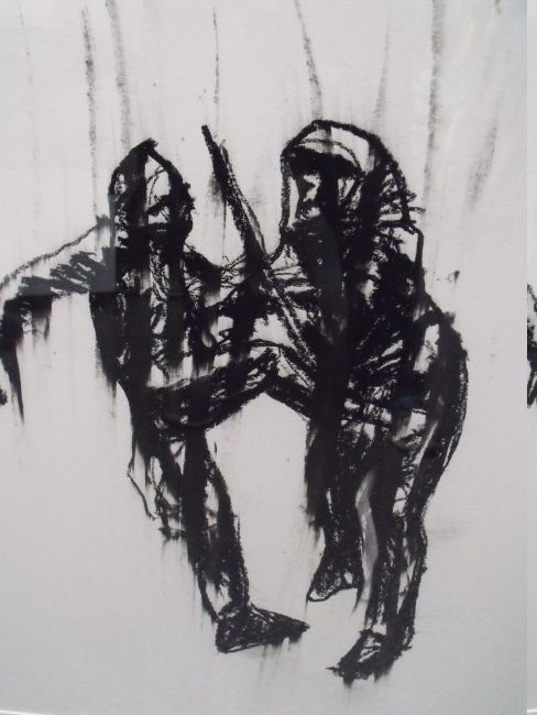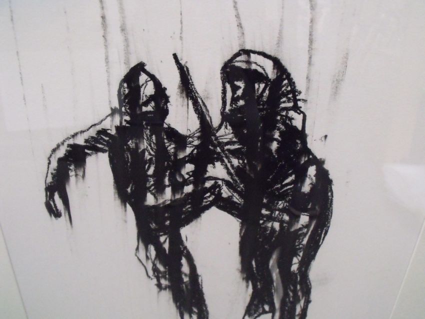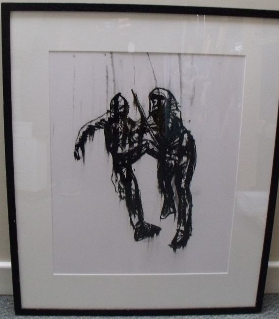 LLOYD AUSTINS (XXI). A contemporary charcoal image of two figures, unsigned, inscribed verso, framed and glazed, 52.5 x 43 cm