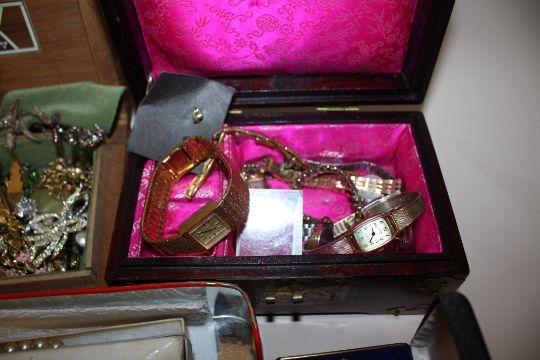 A TRAY OF COSTUME JEWELLERY TO INCLUDE WRIST WATCHES, JEWELLERY BOXES ETC