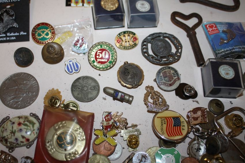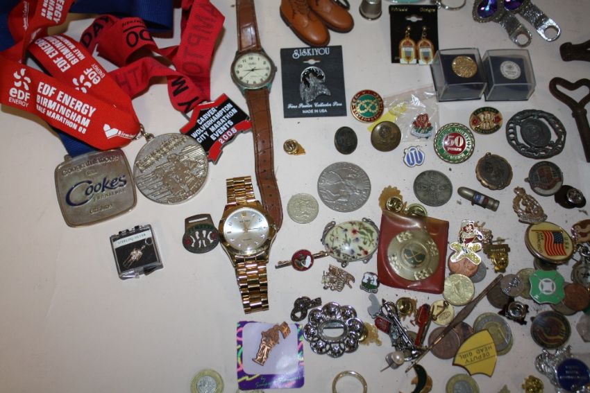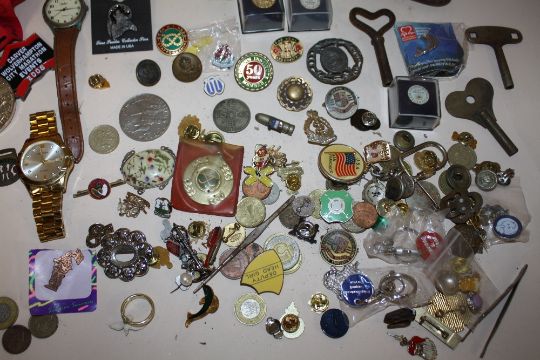 A JAR OF COLLECTABLES TO INCLUDE ENAMEL PIN BADGES, WRIST WATCHES ETC