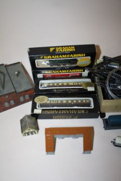 A BOX OF MINIATURE MODEL RAILWAY ACCESSORIES TO INCLUDE LIMA AND GRAHAM FARISH EXAMPLES, HORNBY POWER UNIT ETC.