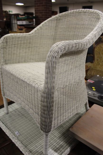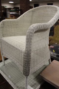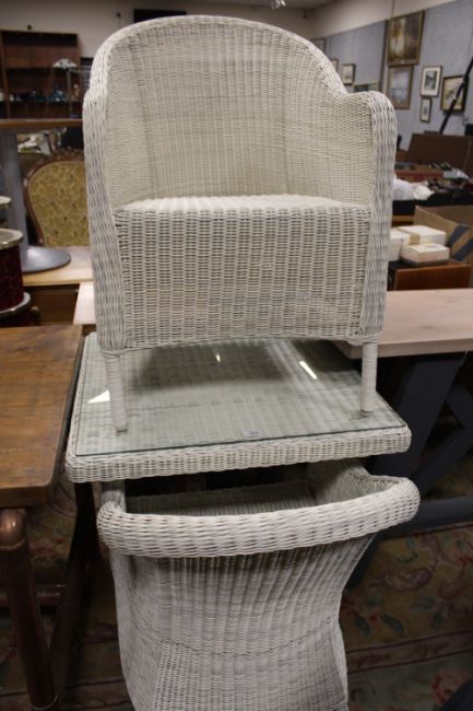 A MODERN LOOM STYLE PATIO TABLE AND TWO ARMCHAIRS