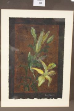 A FRAMED AND GLAZED WATERCOLOUR OF FLOWERS BY LESLIE MILLER (STAFFORDSHIRE ARTIST) SIZE 28 CM X 19 CM