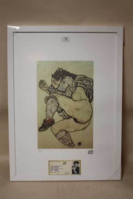 A FRAMED AND GLAZED LIMITED EDITION EGON SCHIELE ABSTRACT PRINT OF A SEMI NUDE FIGURE WITH CERTIFICATE AND S.P.A.D.E.M BLIND STAMP LOWER LEFT SIZE - 27CM X 42.5CM