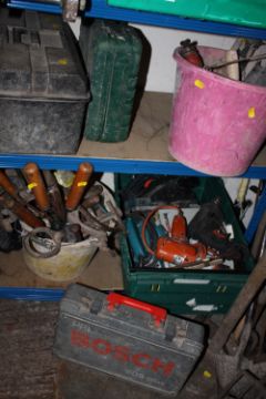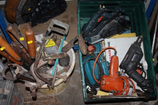 A BUCKET OF HANDTOOLS AND TRAY OF POWERTOOLS TO INCLUDE BLACK 7 DECKER DRILL, BLACK & DECKER PLANNER, SCREWS ETC