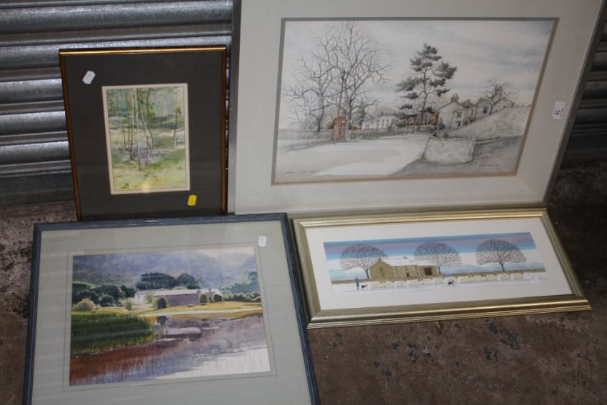 FOUR ASSORTED WATERCOLOURS TO INCLUDE 'BEETHAM IN LATE AUTUMN' BY STANLEY DAWSON, 'WALLOW BARROW COPPICE' BY TIANA MARIE ETC