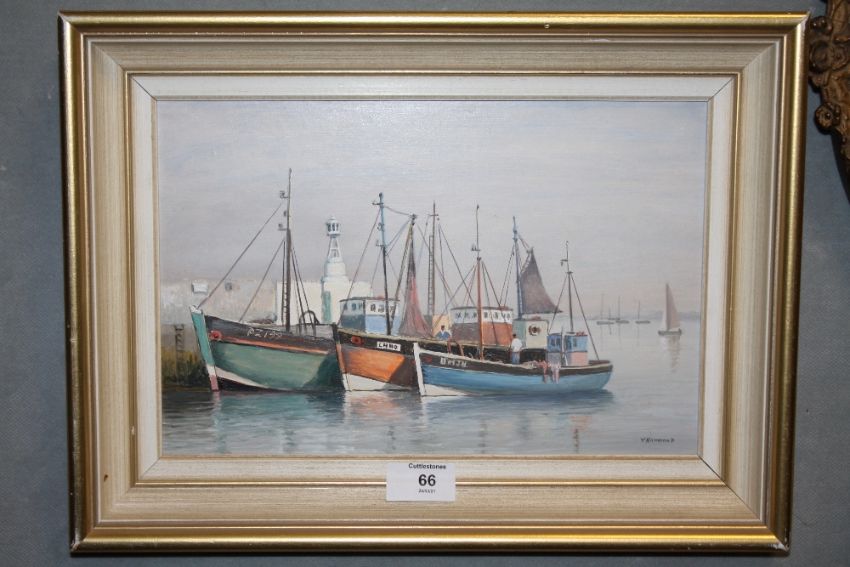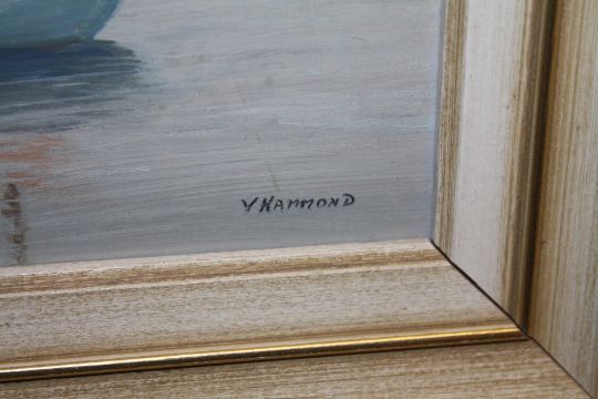 A FRAMED OIL ON BOARD ENTITLED 'BRIXHAM TRAWLERS' BY V HAMMOND - SIZE - 32 CM X 22 CM