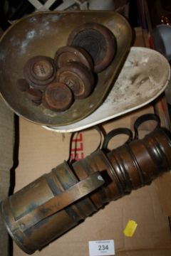 TWO VINTAGE SETS OF SCALES TOGETHER WITH A SET OF FOUR COPPER MEASURES ETC.