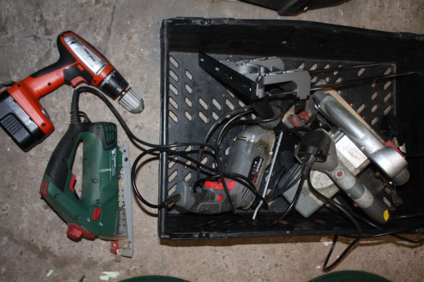TWO TRAYS OF POWER TOOLS ETC TO INC A 200W CIRCULAR SAW - HOUSE CLEARANCE