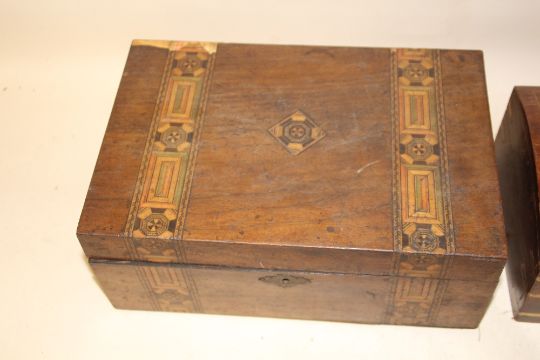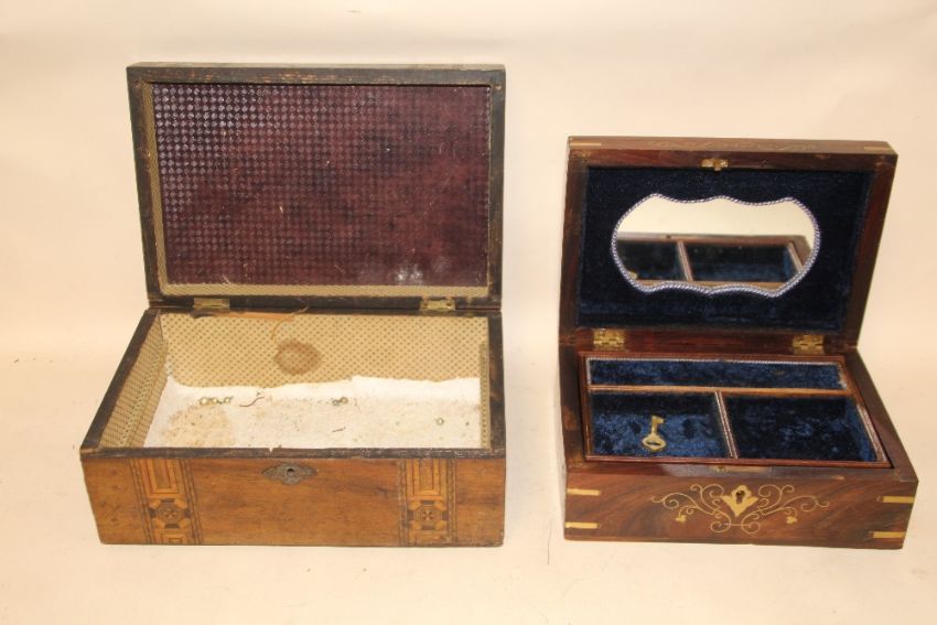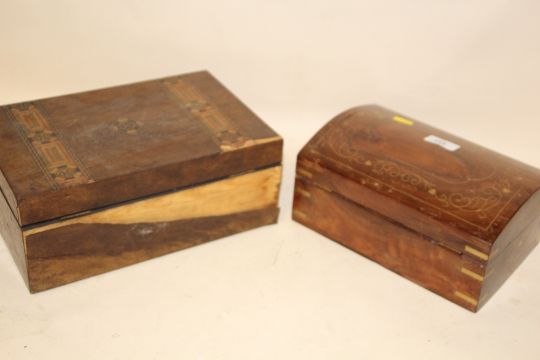 A DOME TOPPED WOODEN JEWELLERY BOX WITH BRASS INLAY, TOGETHER WITH AN INLAID MAHOGANY WORKBOX