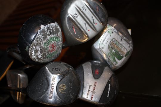 A GOLF BAG AND CLUBS TO INCLUDE HOWSON, DONNAY ETC TOGETHER WITH A WOODEN SLEDGE