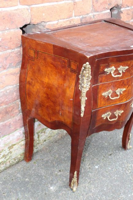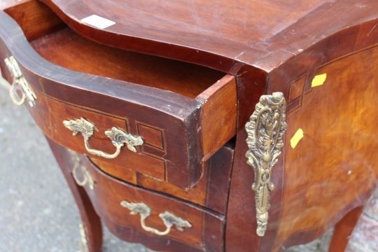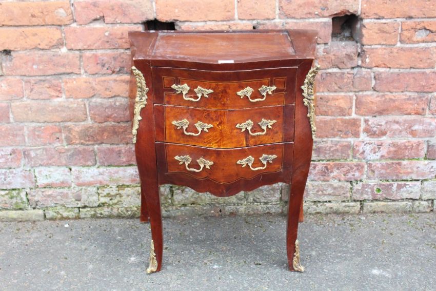 A FRENCH STYLE BOMBE SHAPED THREE DRAWER CHEST WITH GILT METAL MOUNTS, NO MARBLE H-67 W-59 CM