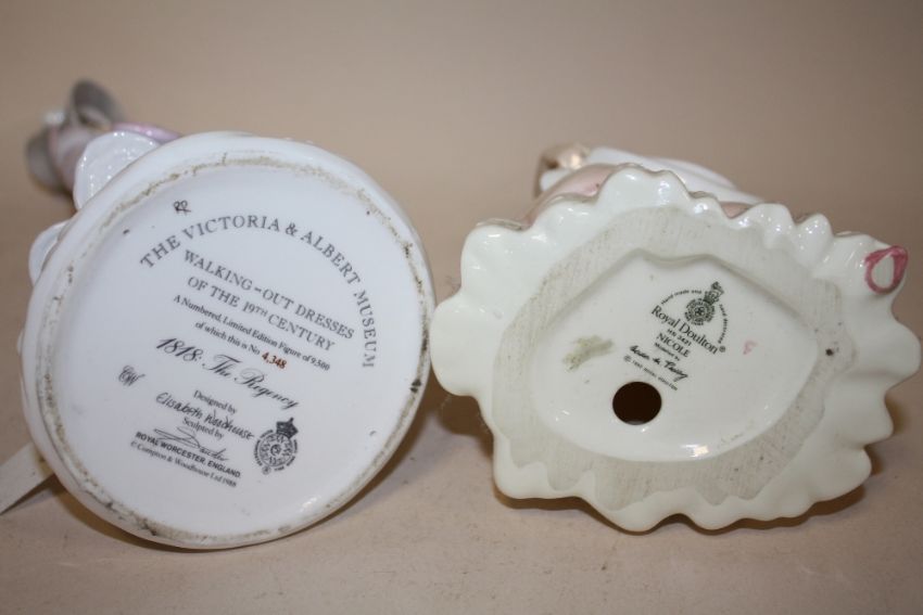 A ROYAL WORCESTER WALKING OUT DRESSES OF THE 19TH CENTURY 1818 THE REGENCY FIGURE, TOGETHER WITH A ROYAL DOULTON NICOLE FIGURE HN 3421 (2)