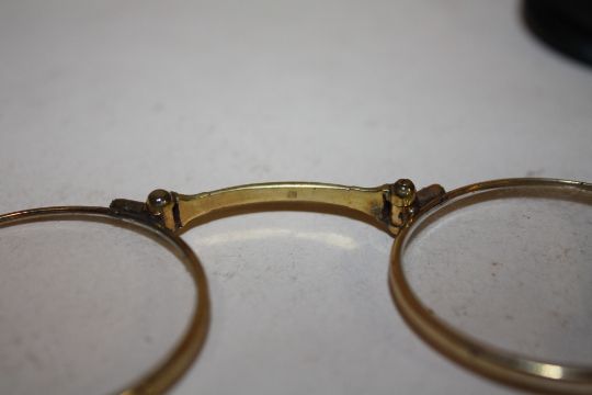 A SET OF YELLOW METAL FOLDING LORGNETTES TOGETHER WITH AND ANGELUS SENTRY TRAVELLING DESK CLOCK AND CALENDAR ETC