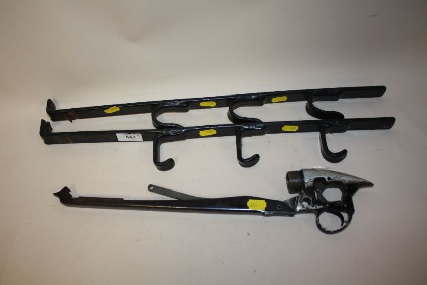 A PAIR OF WALL MOUNTABLE GUN RACKS, TOGETHER WITH AN AIR RIFLE TRIGGER MECHANISM