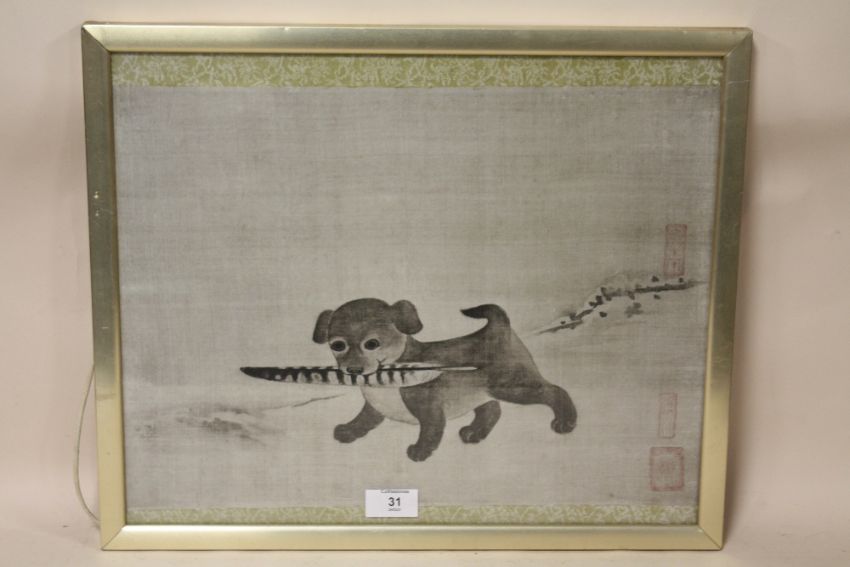 A FRAMED AND GLAZED KOREAN PRINT OF A 17TH CENTURY WATERCOLOUR DEPICTING A PUPPY CARRYING A PHEASANT FEATHER SIZE - 43CM X 36CM
