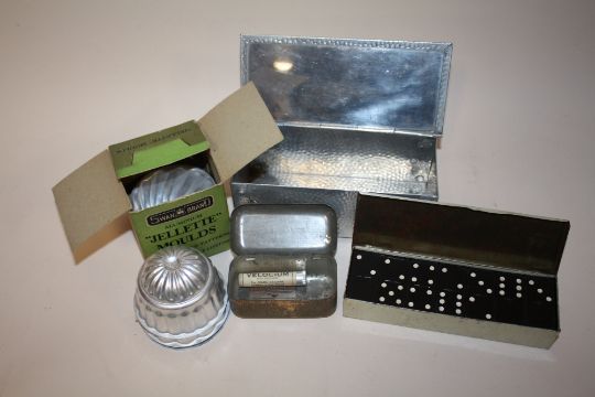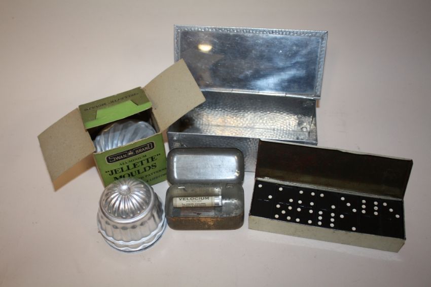A BOX OF COLLECTABLES TO INCLUDE BOXED VINTAGE 'JELLETTE' MOULDS WOODBINES DOMINOES, PLAYERS NAVY CUT TIN ETC.