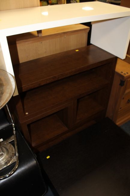 TWO MODERN LOW TABLES AND A SMALL MODULAR BOOKCASE (4)
