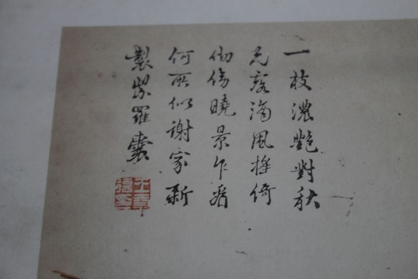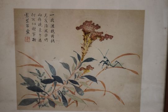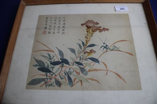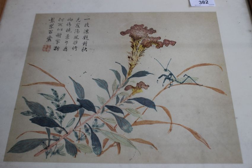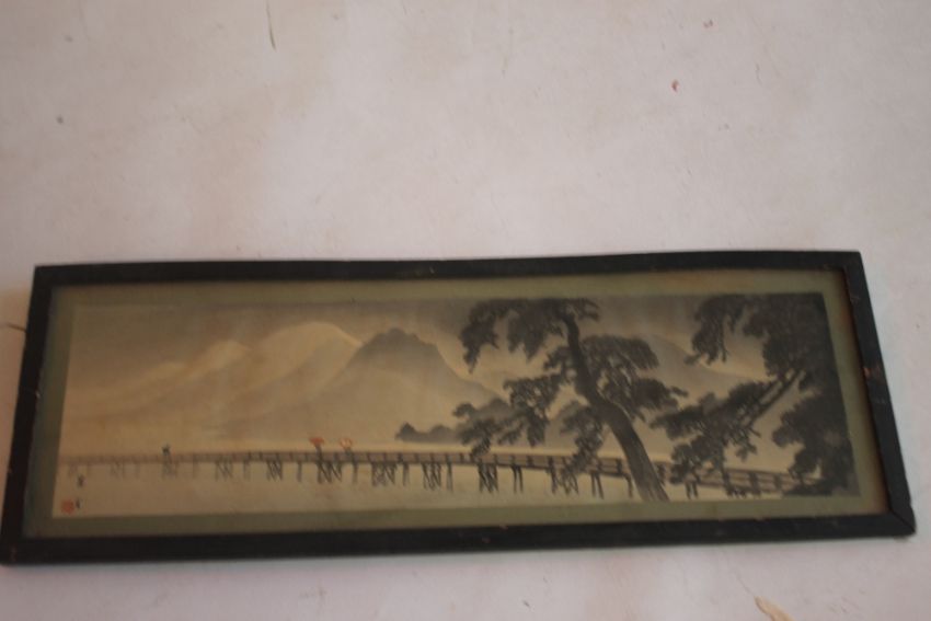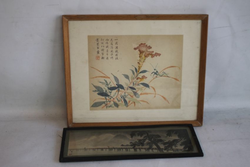 TWO JAPANESE WOODBLOCK PRINTS BOTH FRAMED AND GLAZED, one depicts a causeway in front of mountains 39 cm x 14 cm the other of a flower and matis 41.5 cm x 34 cm