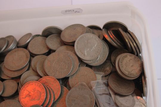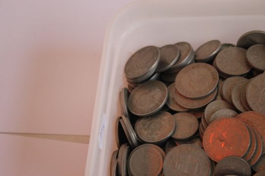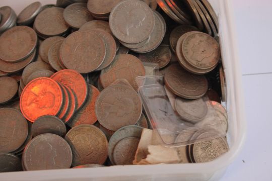 A TUB OF BRITISH AND WORLD COINS, to include a selection of half Crowns
