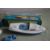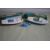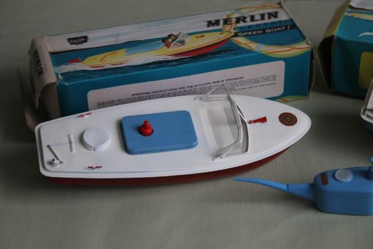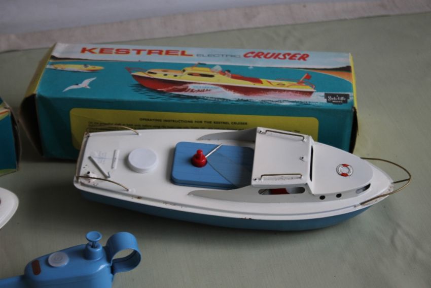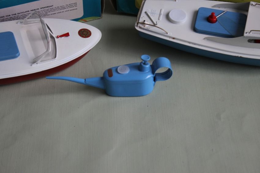 TWO BOXED SUTCLIFFE MODEL ELECTRIC METAL SPEEDBOATS - 'Kestrel' in blue and white (no key) and 'Merlin' in red and white (no key) together with a Sutcliffe oil can (2)
