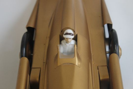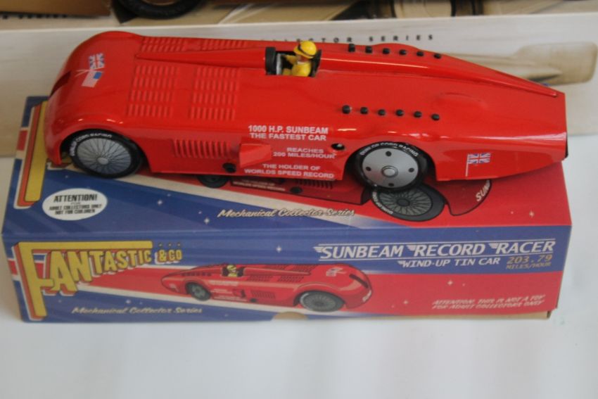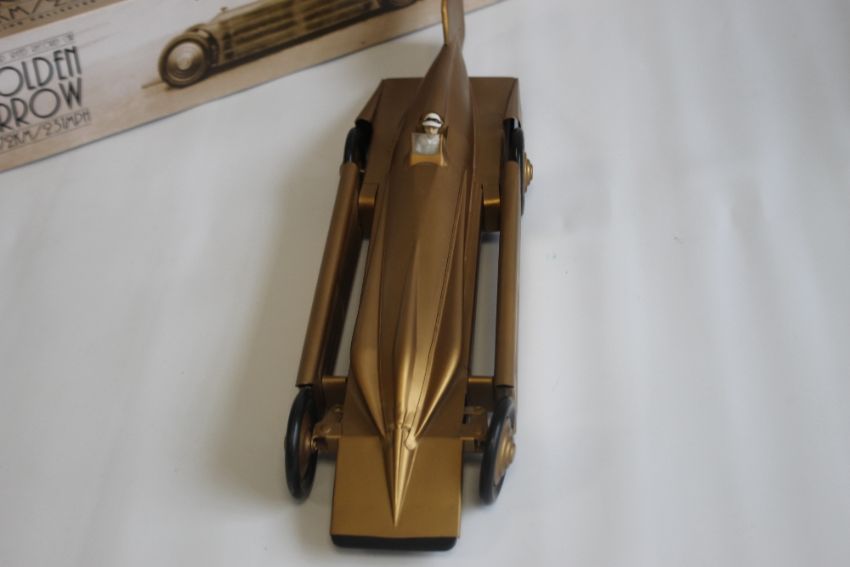 A BOXED 1929 LAND SPEED RECORD CAR "GOLDEN ARROW", from the Schylling Collection complete with Certificate of Authenticity, together with a boxed reproduction tin plate Sunbeam Record Racer wind-up car with key