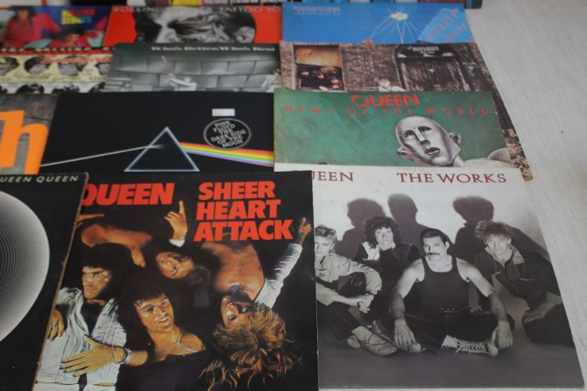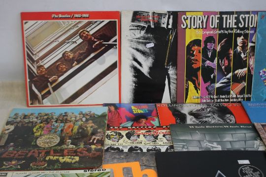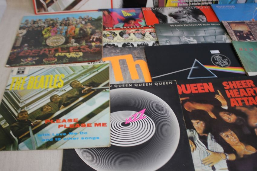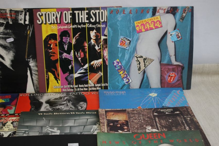 SEVENTEEN LP RECORDS to include seven Rolling Stones(Sticky Fingers, Under Cover, Tattoo You, Still Life, Some Girls, Story of The Stones (Double), Rolling Stones), three The Who (Who's Better Who's Best, Meaty Beaty Big and Bouncy, The Who Collection (Double)), Pink Floyd Dark Side of The Moon, Beatles x 3 (Red Album (Double), Please Please Me, Sgt. Pepper), four Queen (News of the World, The Works, Sheer Heart Attack, Jazz)