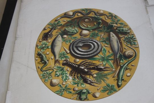LEMERCIER COLOURED LITHOGRAPH PLATES FROM ALEXANDRE SAUZAY - 'Monographie De L'Œuvre De Bernard Palissy Suivie D'Un Choix De Ses Continuateurs Ou Imitateurs Dessinée Par MM. Carle Delange Et C. Borneman Et Accompagnée D'Un Texte Par M. Sauzay Conservateur Adjoint Du Musée Impérial Du Louvre Et M. Henri Delange', c.1862, 78 chromo-lithographed plates of Bernard de Palissy pottery held in European Museum Collections, paper size 36.5 x 54 cm (78)