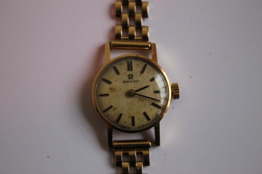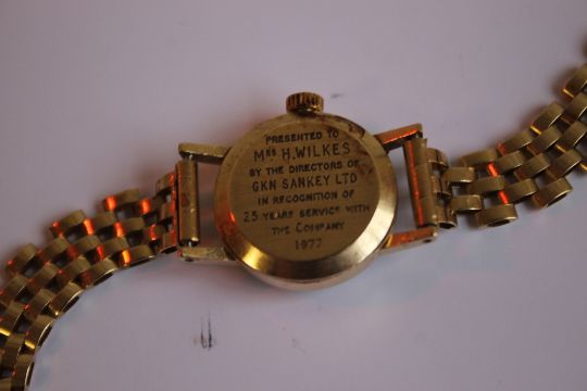 A LADIES OMEGA MANUAL WIND WRIST WATCH on an unbranded 9 ct gold strap, dedication inscription to the back