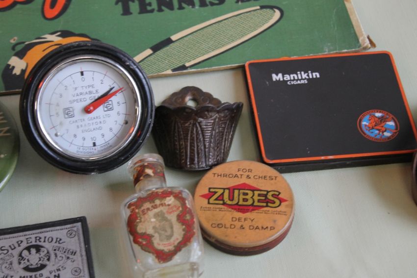 A SELECTION OF COLLECTABLES, to include a Slazenger advertising sign A/F, gauge, tins etc.