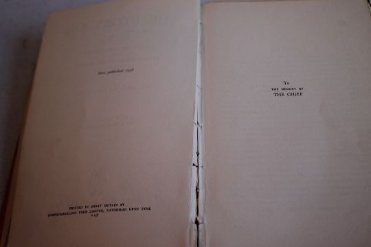 Condition Report:Spine cocked, faded, titles faded. Remains of a Boots sticker on front board, ex-owners name on endpaper. Map, title page and initial pages up to No. 14 partially detached, pages 15,16,17,18 completely detached but present. Photograph detached and then taped in. Various other pages detached but none are missing.