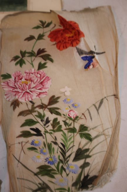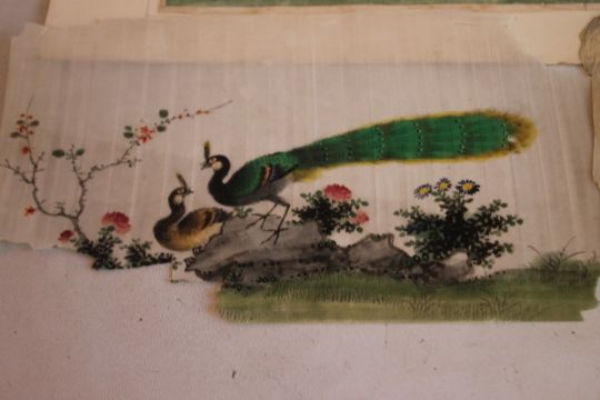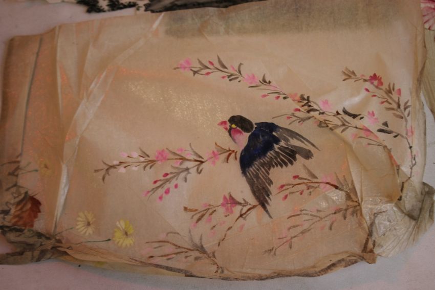 A CHINESE RICE PAPER PAINTING OF A BARGE (HOLE TO CENTRE OF THE PAINTING), 30 cm x 19 cm, together with three paintings of birds