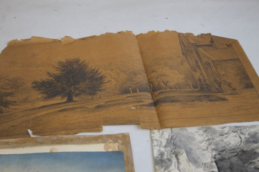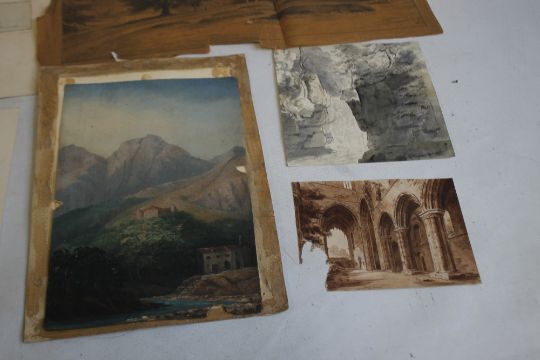 A FOLDER OF ORIGINAL ART WORK to include a small pencil sketch of a figure on paper watermarked 1879 with J. E. Millais in pencil on the back of the mount, a pencil sketch of three children with Sir Geo Hayter in pencil on the backing paper, other pencil sketches labelled D. T., J. Coghlan, Cooke etc., a pencil drawing of a churchyard on very brittle paper signed "Collingwood Smith 1870", an oil painting of a mountain scene that has on the back "Gorbia from above the oil mills, GWG", a monochrome watercolour pencilled J. Cozens on the reverse, a sepia picture of ruins signed W. T. Laslett and another unsigned, an unsigned oil painting of a cormorant on rocks (9)
