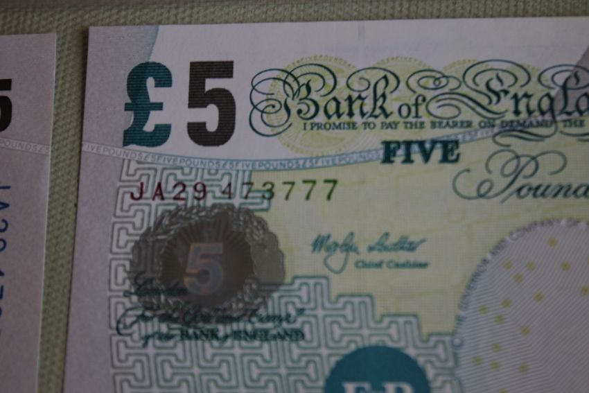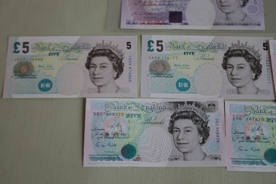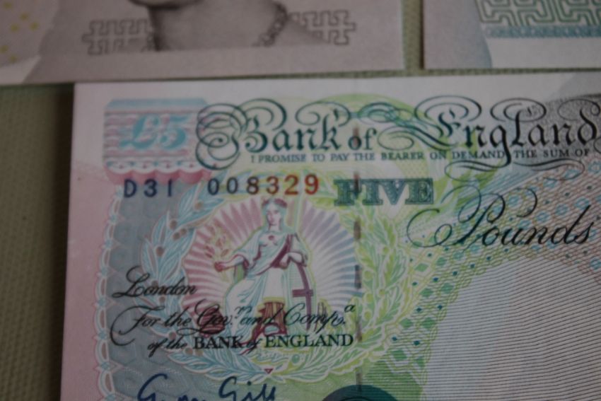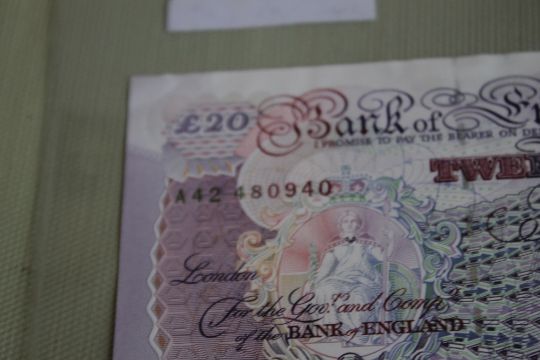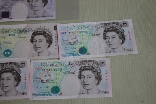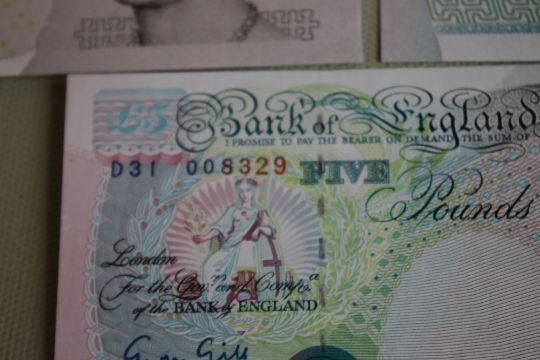 A BANK OF ENGLAND £20 GILL PREFIX AA 42, £5 Gill x 3 prefixes B88, C70 and D31 and Lowther consecutive pair prefix JA29 (6)