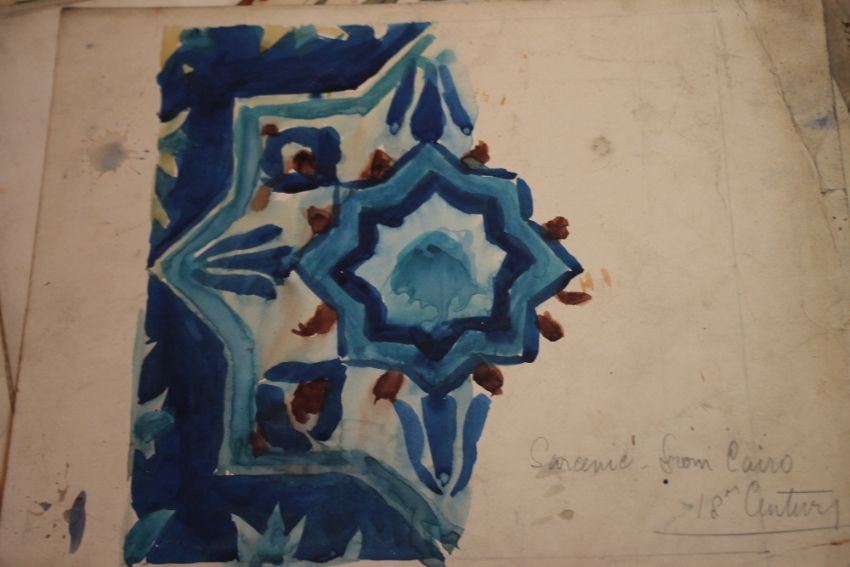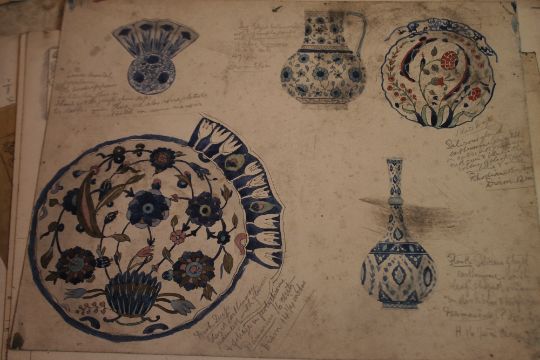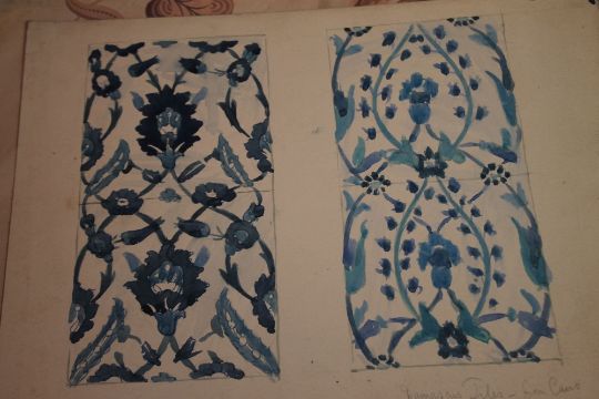 A FOLDER OF ANTIQUARIAN POTTERY DESIGNS IN WATERCOLOUR, ARCHITECTURAL DESIGNS IN PENCIL AND STENCILS, there are no details as to who did them or if there is any association to a pottery, the illustrations have pencilled notes of the items they were copied off such as "Damascus tile", "Plate Rhodian 16th cent.", "Porcelain Chinese 16th or 17th Century", "Half tile Syrian from Cairo" etc.