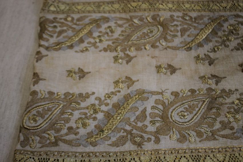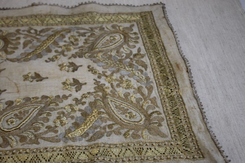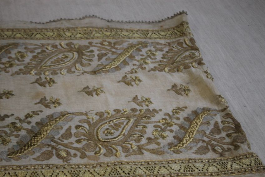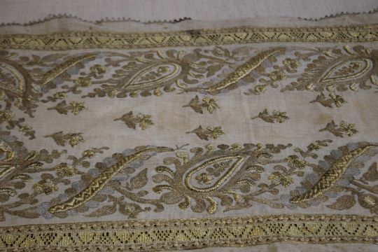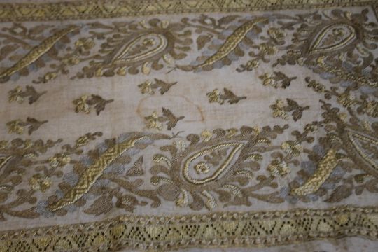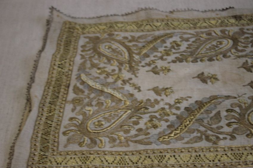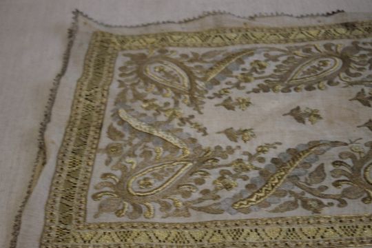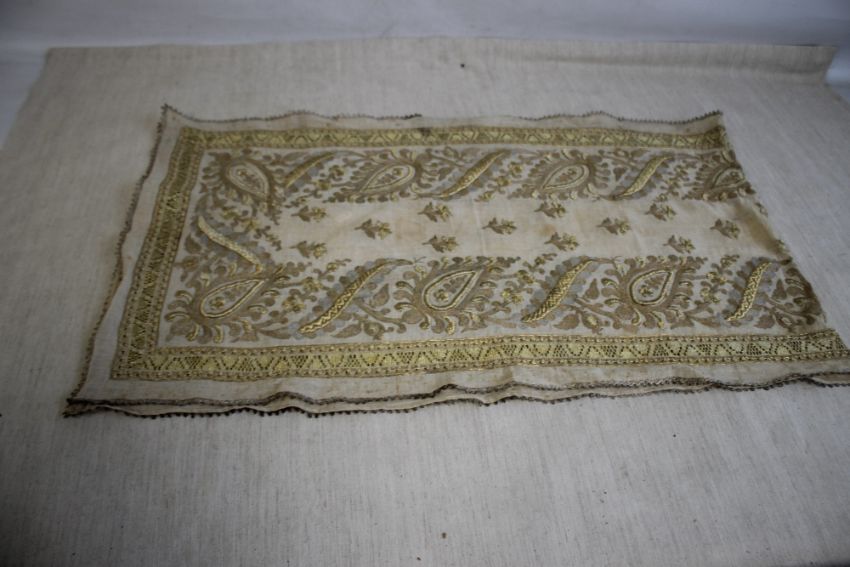 AN ANTIQUE MIDDLE EASTERN DOWRY SHAWL/CLOTH DECORATED WITH HEAVY EMBROIDERED GOLD AND SILVER WIRE THREAD DESIGNS, 179 cm x 52 cm
