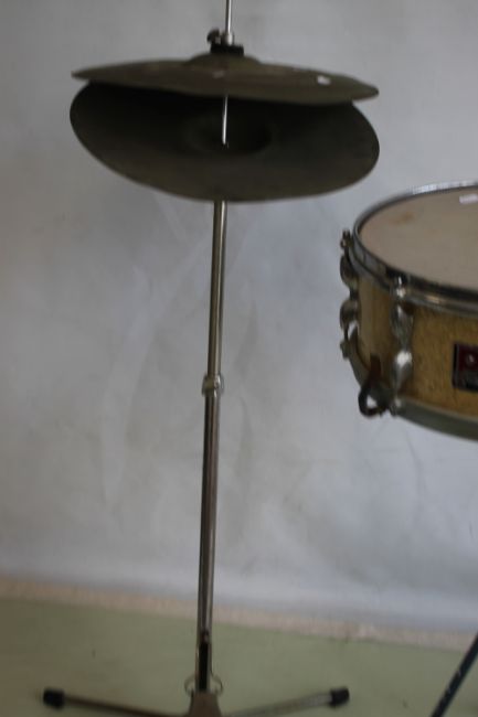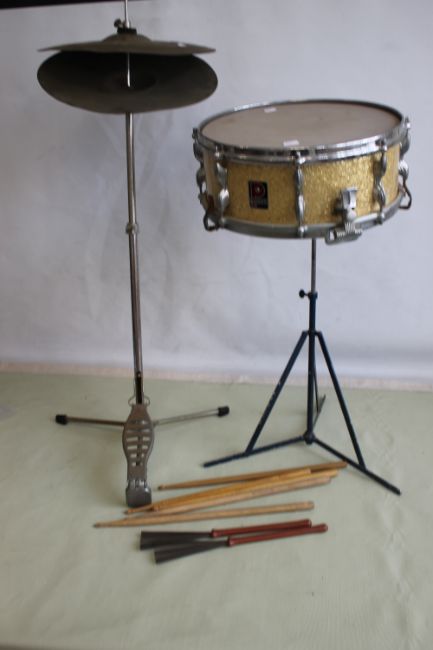 A "PREMIER" 14½" SNARE DRUM ON STAND, together with a pedal cymbal and drumsticks (2)