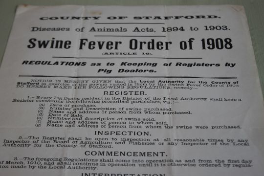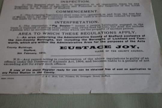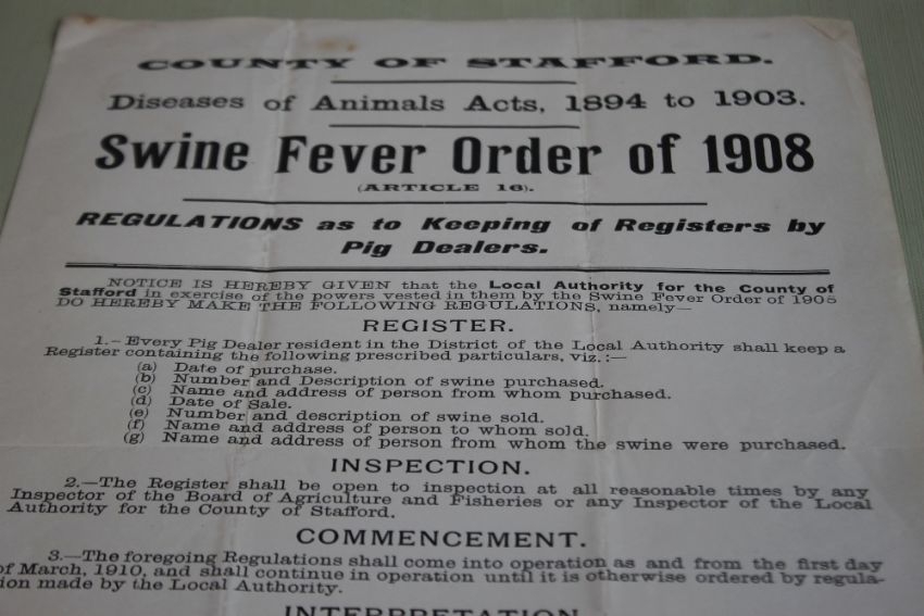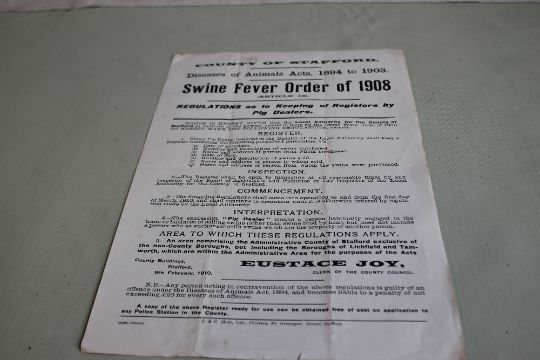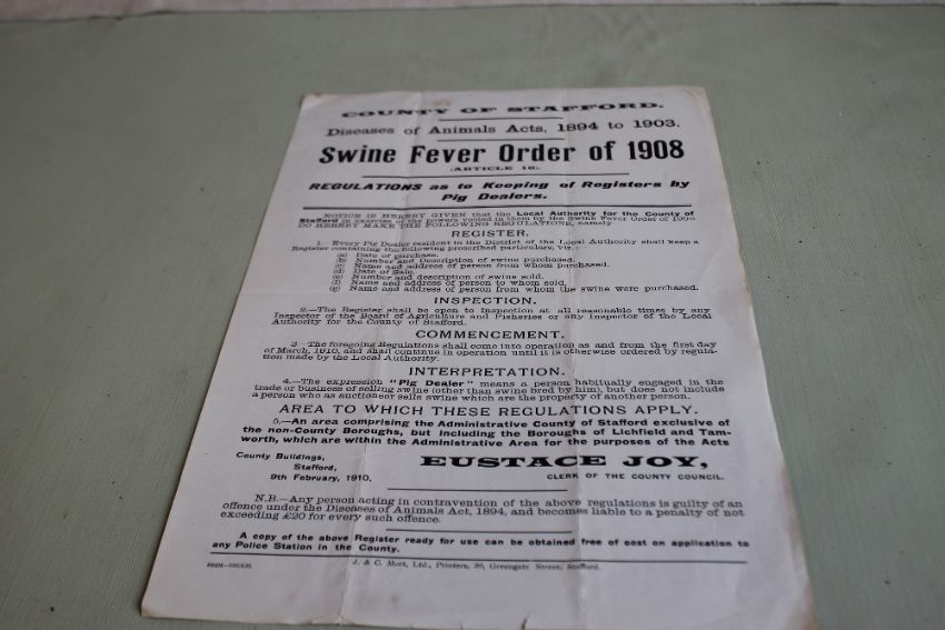 "COUNTY OF STAFFORD - SWINE FEVER ORDER OF 1908" POSTER, black on white print, laying on the local authority rules regarding local pig dealers dated 9th February 1910, 38 x 25.5 cm