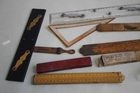 A COLLECTION OF VARIOUS WOODEN AND OTHER RULERS, to include folding types and a printed postal type