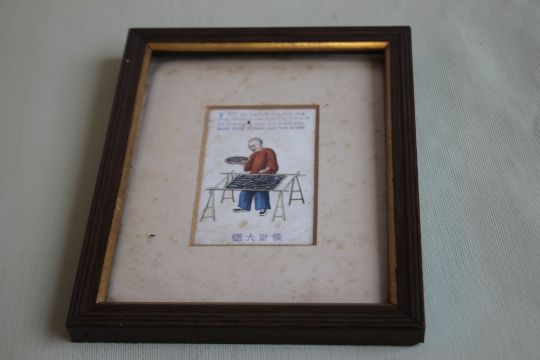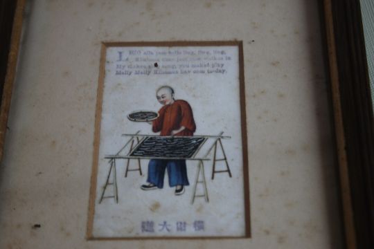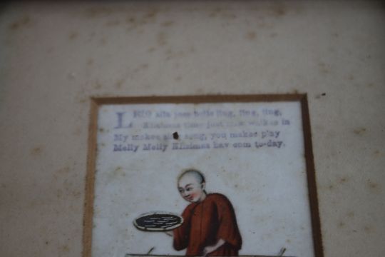 A CHINESE RICE PAPER PAINTING, with unusual "Melly, Melly Klismas" verse, depicting a standing Chinese figure, with Chinese characters below, framed and glazed, frame size 16 x 20 cm