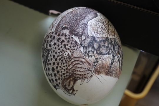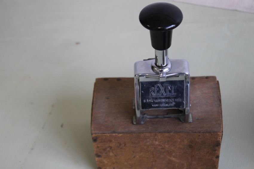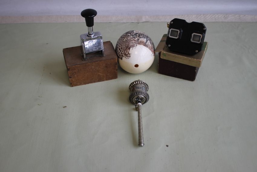 A WHITE METAL TIBETAN PRAYER WHEEL and a carved ostrich egg depicting wild animals, a bakelite viewmaster in a box and a boxed Rexel numbering stamp (4)
