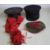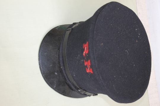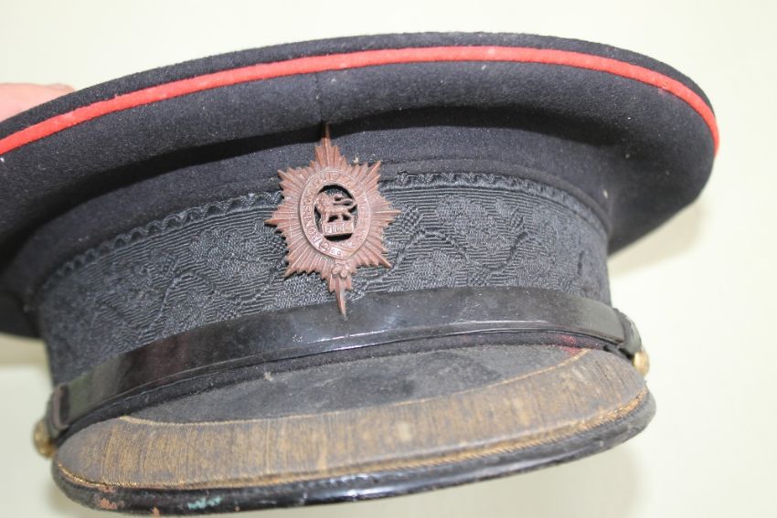 AN OFFICER'S DRESS CAP WITH WORCESTERSHIRE REGIMENT BADGE, a railway cap, a jockey's silk cap and a sash
