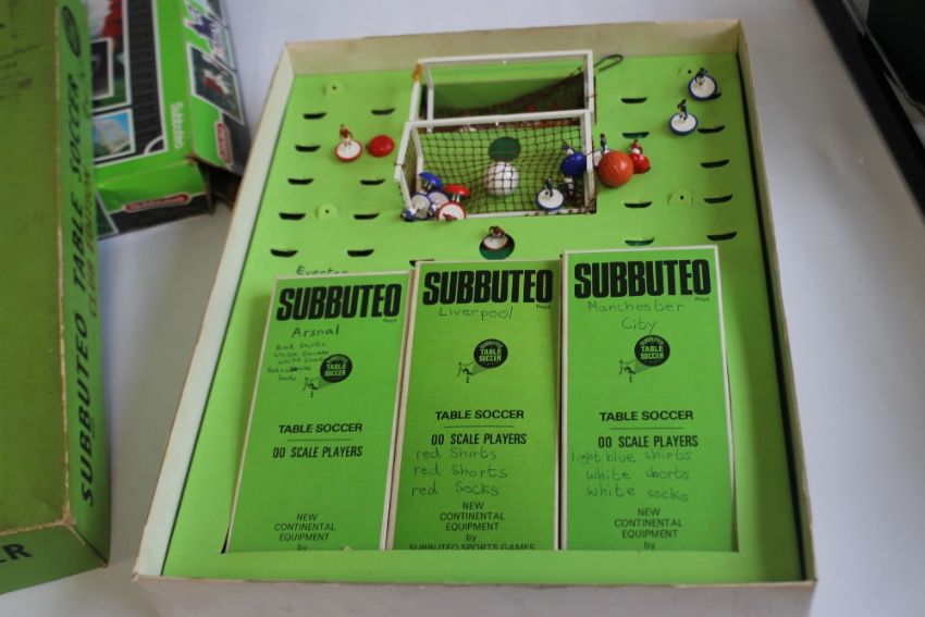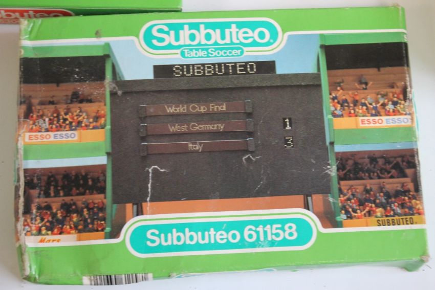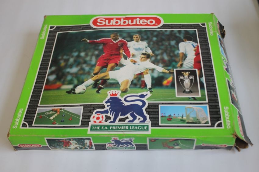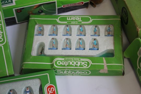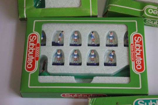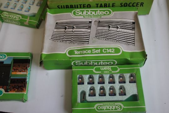 TWO BOXED SUBBUTEO TABLE SOCCER SETS including Continental Club Edition, and FA Premier League Edition , plus four boxed additional teams, a scoreboard 61158 and a terrace set c142