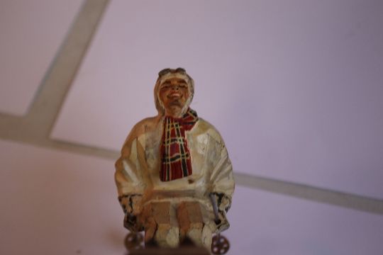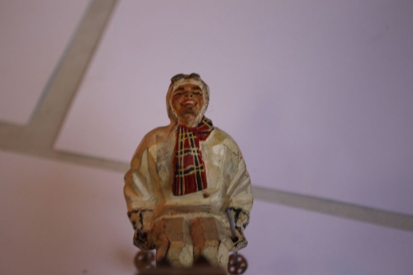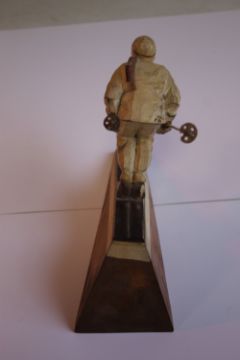 A BLACK FOREST CARVED AND PAINTED WOOD FIGURE OF A SKIER, L 18 cm, H 15 cm, W 7 cm
